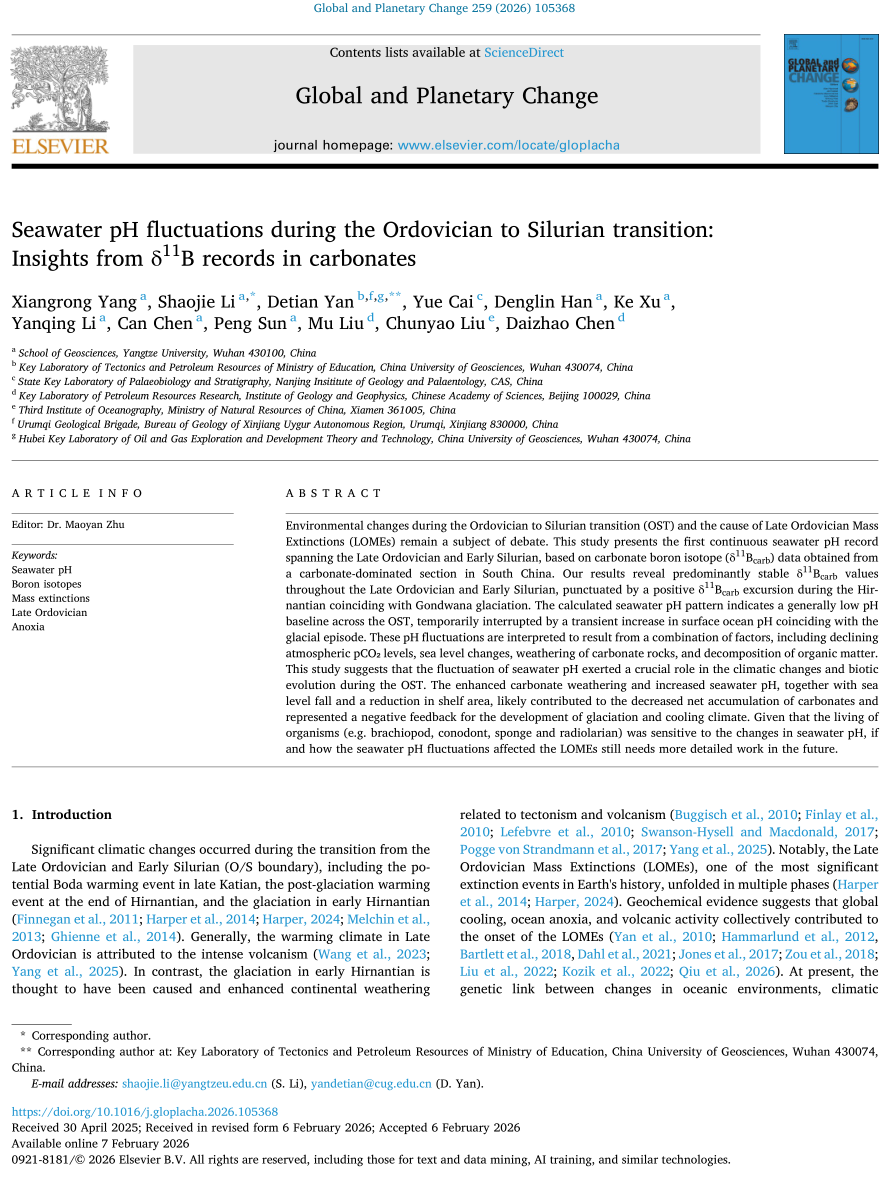 公司伟德国际1949官网杨向荣副教授在中科院一区期刊《Global and Planetary Change》发表题为“Seawater pH fluctuations during the Ordovician to Silurian transition:Insights from δ11B records in carbonates”的研究论文,伟德国际1949官网李劭杰特任教授为第一通讯作者,第一署名单位为伟德国际1949官网(图1)。论文介绍了奥陶纪-志留纪这一重要地质历史转折期内的古气候条件转变过程,及其影响下的表层海水酸碱度(pH)值变化和生物演化过程。