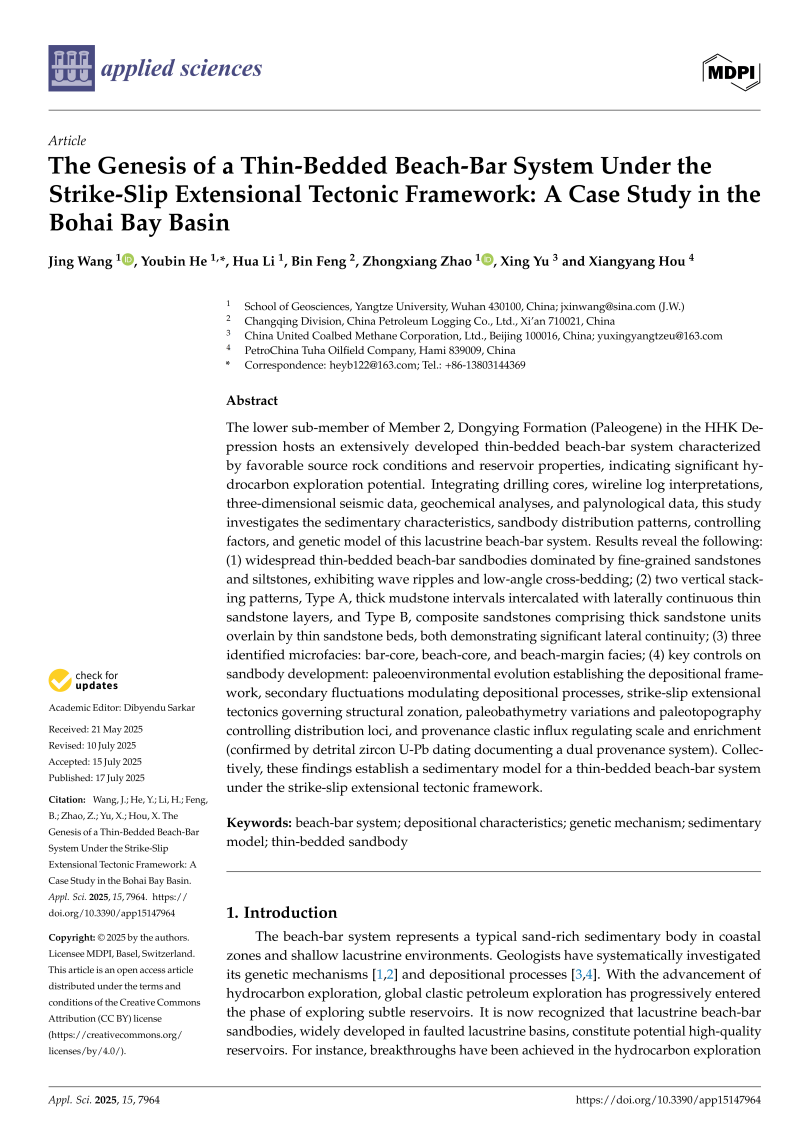 伟德国际1949官网博士生王晶在《Applied Sciences》上发表题为“The Genesis of a Thin-Bedded Beach-Bar System Under the Strike-Slip Extensional Tectonic Framework: A Case Study in the Bohai Bay Basin”的研究论文。伟德国际1949官网为论文第一署名单位,博士生王晶为论文第一作者,其导师何幼斌为通讯作者。