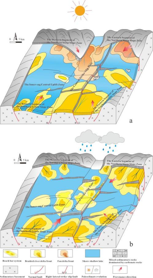 渤海湾盆地HHK凹陷古近系东二下亚段滩坝沉积储集性能好、产能高,是该区古近系中深层岩性圈闭勘探的重要目标。本研究综合岩心、测井、三维地震、地球化学及孢粉学资料,系统分析了研究区滩坝的沉积特征、砂体展布规律、控制因素及发育模式。结果表明:(1)滩坝砂体以细砂岩与粉砂岩为主,发育波状层理与低角度交错层理,呈薄层广泛分布;(2)垂向组合具两种典型样式:A类(厚层泥岩夹横向连续薄砂岩)与B类(厚层砂岩与薄层砂岩叠置的复合砂体),均表现出显著侧向连续性;(3)识别出坝主体、滩主体与滩侧缘三种沉积微相;(4)砂体发育主要受五大因素控制:古环境控制宏观演化,走滑-拉张构造背景控制构造分带性,湖平面变化调节沉积过程,古水深变化与古地貌共同控制砂体分布位置,物源供给制约了砂体富集程度;(5)建立了走滑-拉张构造背景下薄层滩坝沉积体系的沉积模式。