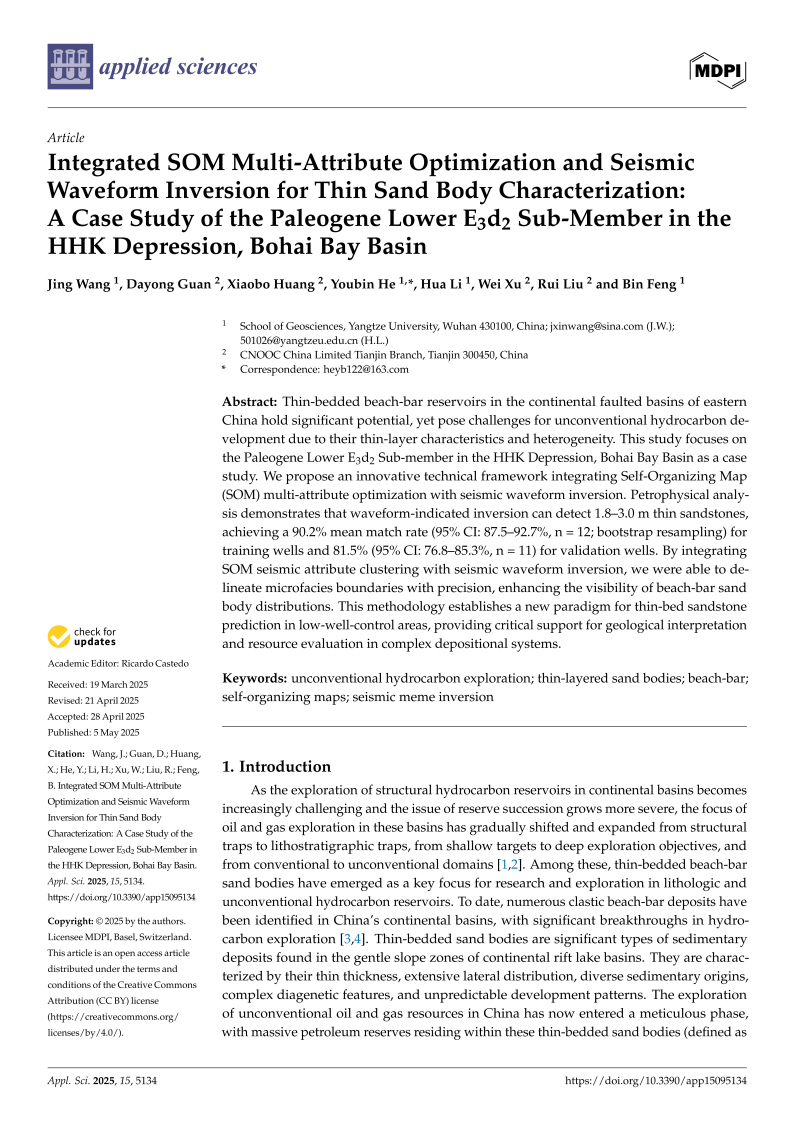 伟德国际1949官网博士生王晶在《Applied Sciences》上发表题为“Integrated SOM Multi-Attribute Optimization and Seismic Waveform Inversion for Thin Sand Body Characterization: A Case Study of the Paleogene Lower E3d2 Sub-Member in the HHK Depression, Bohai Bay Basin”的研究论文。伟德国际1949官网为论文第一署名单位,博士生王晶为论文第一作者,其导师何幼斌为通讯作者。