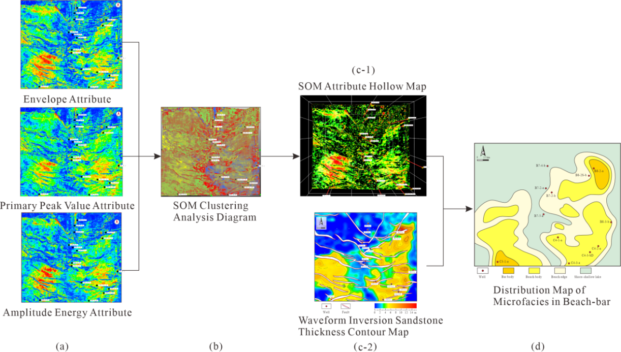 图1. 基于SOM多属性优化与地震波形反演融合的HHK凹陷东二下亚段滩坝沉积微相精细表征流程图
