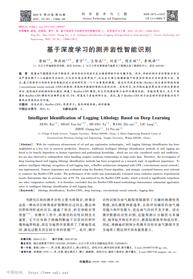 伟德国际1949官网硕士生曾锐在邵燕林副教授的指导下,在EI期刊《科学技术与工程》发表题为“基于深度学习的测井岩性智能识别”的研究论文,伟德国际1949官网与非常规油气地质与工程湖北省工程研究中心为论文第一署名单位,硕士生曾锐为论文第一作者,其导师邵燕林副教授为该文通讯作者。