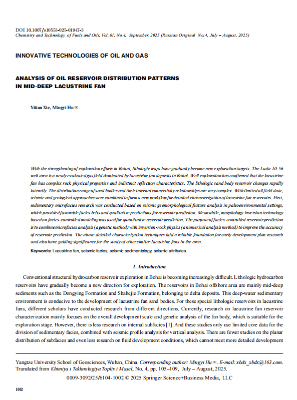 近日,地科学院硕士生解祎恬在胡明毅教授的指导下,在期刊《Chemistry and Technology of Fuels and Oils》上发表题为“Analysis of Oil Reservoir Distribution Patterns in Mid-Deep Lacustrine Fan”的研究论文,伟德国际1949官网为论文第一署名单位,硕士生解祎恬为第一作者,其导师胡明毅教授为该文通讯作者。