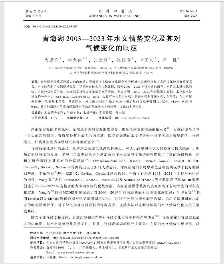 近日,伟德国际1949官网23级硕士研究生农爱乐以第一作者身份在中文核心期刊《水科学进展》(IF 5.098)上发表题为“青海湖2003—2023年水文情势变化及其对气候变化的响应”的研究论文(图1)。伟德国际1949官网为论文第一署名单位,其导师相龙伟为论文通讯作者。