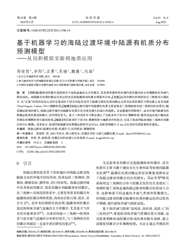 近日,地科学院2023级地质学专业硕士生邵俊哲以第一作者身份在中文核心期刊《沉积学报》上发表题为“基于机器学习的海陆过渡环境中陆源有机质分布预测模型”的研究论文。硕士生邵俊哲为论文第一作者,伟德国际1949官网为第一完成单位。
