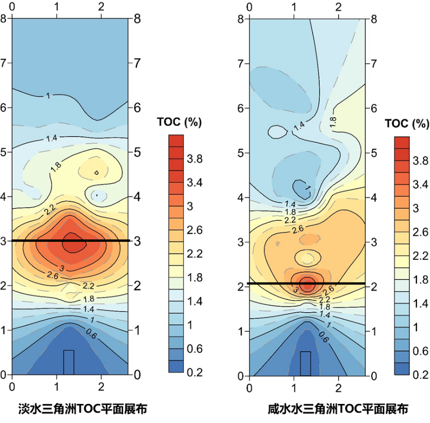 结果表明海陆过渡环境中的陆源有机质主要富集在三角洲前缘和前三角洲沉积相带内,随着搬运距离的增大,海陆过渡环境中的陆源有机质丰度呈现先增大后减小的趋势。在盐絮凝作用影响下,咸水环境中陆源有机质搬运距离更靠近物源区,沉积厚度更大。基于随机森林、人工神经网络和支持向量机三种深度学习算法建立了实验条件下的TOC预测模型,优选出基于随机森林算法的预测模型具有最高的预测准确度和稳定性。基于实验条件下最优模型的输入特征,建立了地质条件下的TOC预测模型。