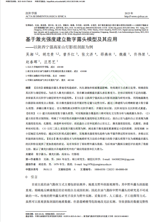 伟德国际1949官网2023级地质资源与地质工程专业硕士研究生吴湘在中文核心期刊《沉积学报》上发表了题为“基于激光强度建立数字露头模型及其应用——以陕西宁强高家山灯影组剖面为例”的研究论文。伟德国际1949官网为论文第一署名单位,硕士生吴湘为第一作者,胡忠贵教授为通讯作者。