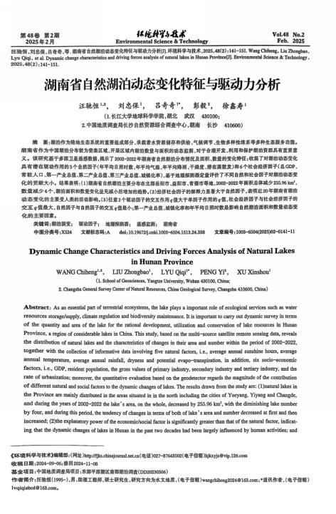 伟德国际1949官网2023级硕士研究生汪驰恒在《环境科学与技术》期刊发表题为“湖南省自然湖泊动态变化特征与驱动力分析”的研究论文。伟德国际1949官网为论文第一署名单位,硕士研究生汪驰恒为论文第一作者。