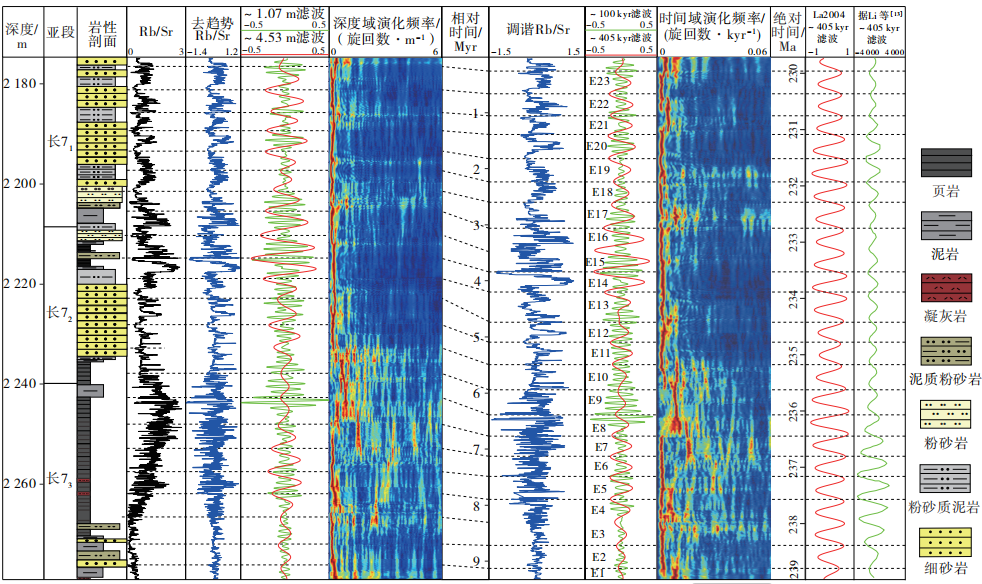 三叠世是地球系统从干旱向湿热气候过渡的关键时期,鄂尔多斯盆地在此期间湖盆发育达到鼎盛(长7段),广泛沉积了一套具有重要勘探潜力的灰黑色页岩。然而,该套地层的年代格架尚有争议,制约了盆地非常规油气资源的精确评价。本研究以湖盆中心A1井长7段岩心(2175 m–2279.24 m)为研究对象,基于高分辨率X射线荧光(XRF)元素数据,优选Rb/Sr比值作为古气候替代指标,运用旋回地层学的方法识别轨道周期信号,旨在建立湖相地层的绝对天文年代标尺,并恢复沉积期古湖平面变化。