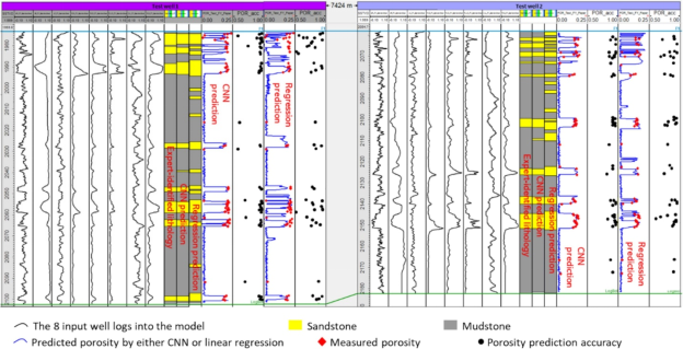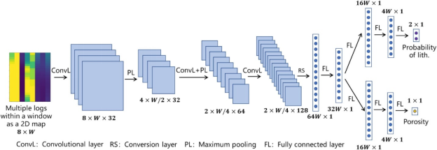 岩性识别和孔隙度预测是油气勘探开发及储层评价中的关键环节,对油气储量评估、储层建模以及地下资源开发具有重要意义。传统方法通常依赖测井曲线交会图、经验公式或统计学习方法,但这些方法往往仅利用单个深度点的测井信息,难以充分挖掘测井曲线在垂向邻域中的地质信息,因此在复杂储层条件下预测精度仍然有限。针对这一问题,该研究提出了一种基于深度滑动窗口和卷积神经网络的联合预测方法。该方法通过构建滑动窗口提取目标深度上下范围内的多种测井曲线信息,并将其转换为二维数据结构作为输入,利用卷积神经网络自动提取特征并预测窗口中心位置的岩性类型与孔隙度。当滑动窗口沿井筒垂向移动时,模型即可快速完成整个井段的连续预测,实现高效、自动化的测井解释。研究团队利用中国东部某油田289口井的测井数据对方法进行了验证,数据包含伽马(GR)、自然电位(SP)、深电阻率(RLLD)、声波时差(AC)、井径(CAL)等8类测井曲线。实验结果表明,当滑动窗口长度为1.125 m时模型表现最佳,其中,岩性识别准确率可达到94.4%,孔隙度预测准确率达到94.9%。研究结果表明,该方法不仅预测精度高,而且计算效率快,可在油气田新井和老井资料解释中快速推广应用,为智能测井解释和油气储层评价提供了一种新的技术思路。该研究得到了伟德国际1949官网油气资源勘探技术教育部重点实验室开放基金以及中国石油天然气集团公司创新基金等项目的资助。