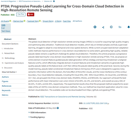 伟德国际1949官网高贤君副教授组研究型论文“PTDA: Progressive Pseudo-Label Learning for Cross-Domain Cloud Detection in High-Resolution Remote Sensing”(第一作者:2023级硕士生匡金,通讯作者: 高贤君副教授)被中科院一区TOP期刊IEEE Transactions on Geoscience and Remote Sensing (TGRS,CCF B类期刊,IF = 8.6)录用。