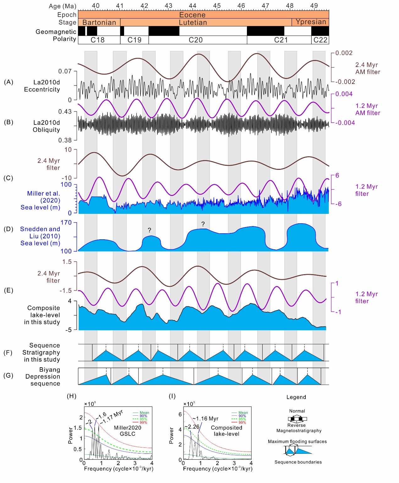 在全球变暖加剧水文循环的背景下,研究地质历史时期温室气候的水文响应模式具有重要意义。论文聚焦于始新世中晚期(约49.6百万至39.3百万年前)的南襄盆地泌阳凹陷,选取该凹陷核三段地层为研究对象,基于三口钻井的测井数据,运用旋回地层学与沉积噪声模拟等先进方法,成功重建了该时期高分辨率的古湖面演化史,并揭示了其与全球海平面变化的关联机制。
