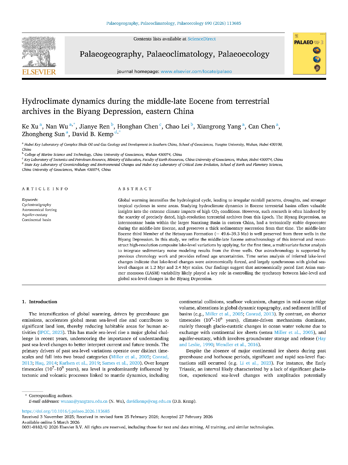 伟德国际1949官网教师许可以第一作者身份,在地球科学领域国际权威期刊《Palaeogeography, Palaeoclimatology, Palaeoecology》上发表了题为“Hydroclimate dynamics during the middle-late Eocene from terrestrial archives in the Biyang Depression, eastern China”的研究论文。伟德国际1949官网为论文第一署名单位。该研究得到了国家自然科学基金的资助。