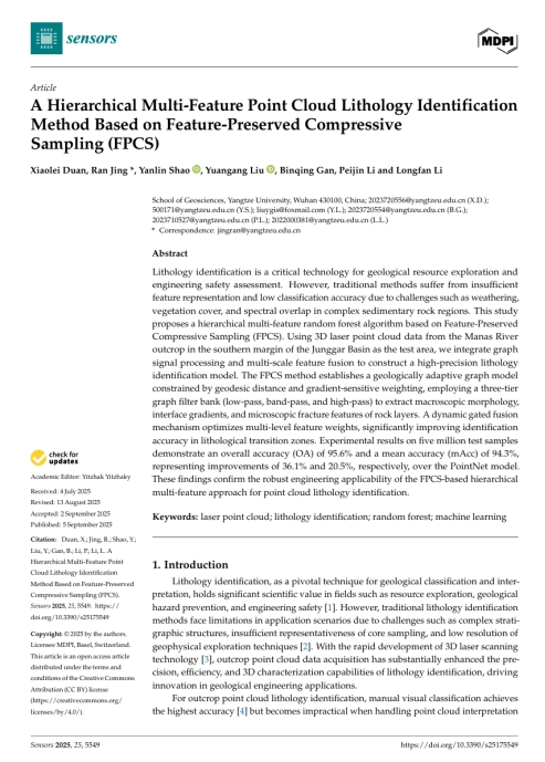 公司硕士研究生段晓磊参与撰写的论文“A Hierarchical Multi-Feature Point Cloud Lithology Identification Method Based on Feature-Preserved Compressive Sampling (FPCS)”发表于期刊《Sensors》。伟德国际1949官网为论文第一署名单位,段晓磊为第一作者,井然老师为通讯作者。