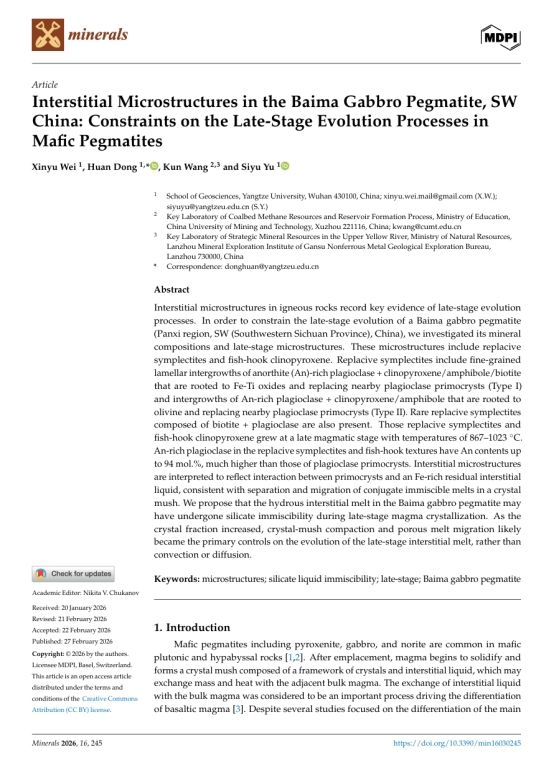 伟德国际1949官网硕士生魏新宇在《Minerals》上发表题为“Interstitial Microstructures in the Baima Gabbro Pegmatite, SW China: Constraints on the Late-Stage Evolution Processes in Mafic Pegmatites”的研究论文。伟德国际1949官网为论文第一署名单位,其导师董欢副教授为通讯作者。论文获得国家自然科学基金、国家科技重大专项以及自然资源部黄河上游矿产资源成矿与勘察重点实验室资助。