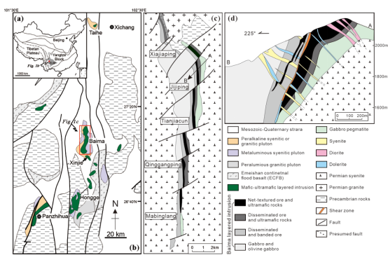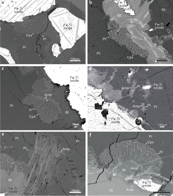本研究以攀西地区白马辉长伟晶岩为对象,系统分析岩石矿物组成及显微结构,为认识白马辉长伟晶岩晚期岩浆演化过程提供了新的证据。论文指出,白马辉长伟晶岩中发育多种显微结构,主要包括鱼钩状单斜辉石和多种替代交生结构。其中,替代交生结构主要表现为富钙斜长石与单斜辉石、角闪石或黑云母的细粒交生体。这些结构与前人关于层状岩体研究中所记录的岩浆晚期显微结构(Dong et al., 2023; Holness et al., 2011; Keevil et al., 2020)极为相似。本研究通过矿物温度计计算结果表明,白马辉长伟晶岩中的显微结构形成于867–1023℃的晚期岩浆阶段。通过对这些显微结构中矿物成分的分析,并结合显微结构整体成分计算,研究发现白马辉长伟晶岩中的显微结构是主晶矿物与粒间富铁熔体反应形成。主晶矿物斜长石中的熔体包裹体成分显示,白马辉长伟晶岩在结晶过程中很可能发生了硅酸盐液态不混溶,形成了共轭的富硅熔体和富铁熔体。随着晶体比例增加,晶粥压实和多孔熔体迁移可能取代对流或扩散,成为控制晚期间隙熔体演化的主要机制。