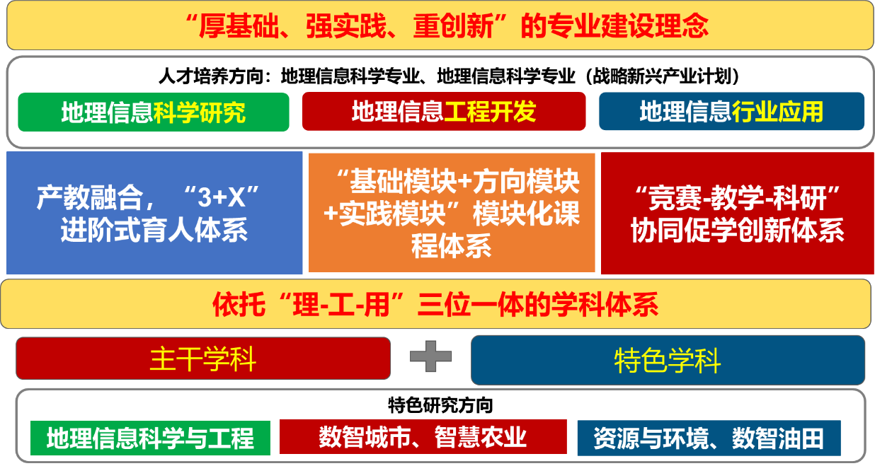 形成了“基础模块+方向模块+实践模块”的模块化课程体系。基础模块涵盖学科专业基本理论与方法;方向模块设置GIS方法研究、GIS软件开发和GIS行业应用;实践模块通过校企共建实验室,强化工程能力培养。建成并线上开放了“地图学原理及应用”(学堂在线)省级一流课程;跨学科整合优质资源,面向高年级员工开设“沉积岩石学”(国家级一流课程)、“遥感地学应用”等交叉学科课程,依托学校测绘、遥感、地质、石油、农学等优势学科,培养“GIS+能源”、“GIS+环境”等复合型人才,拓宽了毕业生的就业领域。