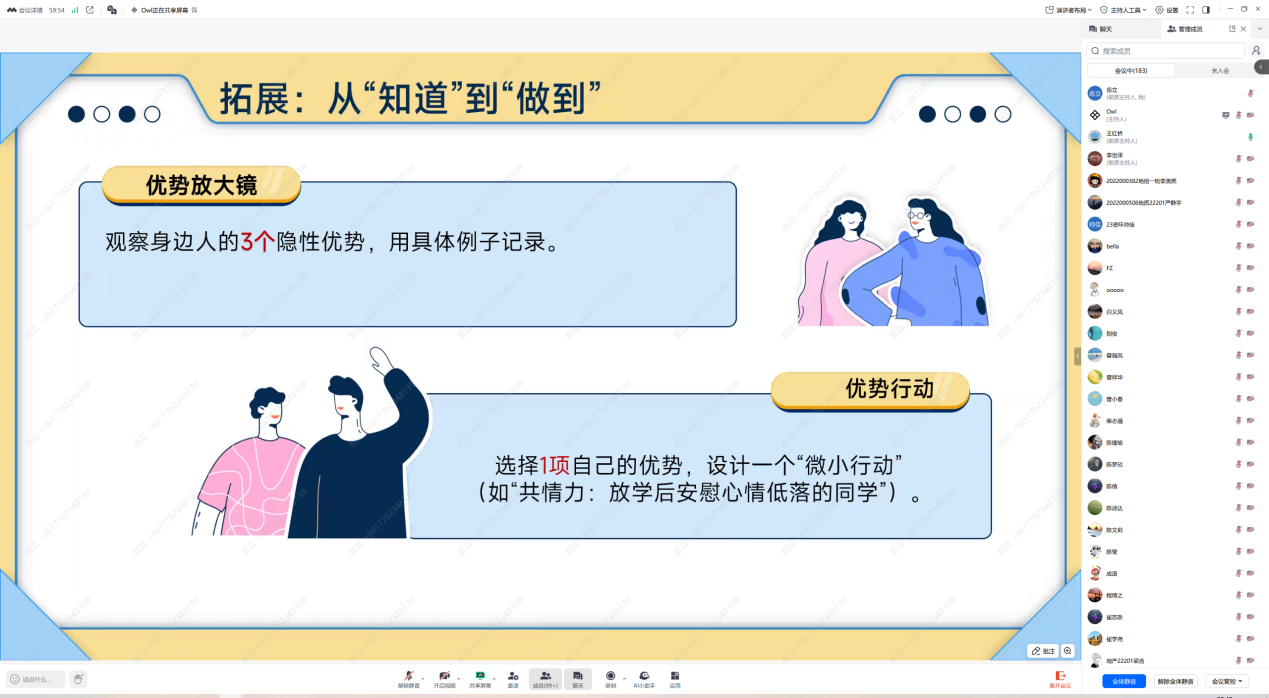 (通讯员 郝兴瀚)为筑牢校园心理防线,5月22日、23日晚,公司心理专干王红桥老师在13教B122主讲“认识自己,悦纳自己”心理健康培训,2024级141名员工骨干现场参与,线上本、研究生各年级累计452人通过腾讯会议同步学习。 王红桥老师从生理自我、心理自我、社会自我三个维度展开对自我认知的讲解,并分享增强自我认同的两个自我探索的方法:“20个我是谁”、“每日优点记录”,她还介绍了“优势卡牌”,引导同学们通过与他人的互动发现潜在优势。结合老员工心理困惑案例,王老师带领同学们剖析自我认知偏差的成因与表现,深化了大家对自我认知的理解。对于如何悦纳自己的缺点与不足,王老师用具体生活事例说明不同特质在学习、生活和职业发展中的作用,并分享“优势探索表”,指导大家转换对缺点的看法和评价,提升心理健康水平。 此外,王老师强调了员工骨干在校园心理健康工作中的重要作用,邀请大家履行职责,以身作则做示范、宣传知识、关注同学动态并及时反馈、推荐有需要的同学寻求专业帮助。培训最后还介绍了心理中心的服务项目与学校四级心理危机干预体系的运作机制,呼吁大家积极参与心理健康教育,共筑校园心理防护网。 (审核 冯舒 编辑 王红桥)