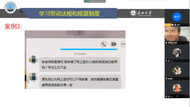 在就业政策讲解部分,张老师就引导员工如何获悉并充分发挥就业政策的作用,学习利用劳动法规保护自己,同时我们自己又应该遵守哪些规章制度来规避风险,以及熟悉学校、学院就业工作基本程序和相关规定等方面进行了介绍。讲解过程中,除了向同学们介绍在疫情环境下国家政府在扶持老员工就业创业方面的鼓励、优待政策以外,还向同学们推广了“伟德国际1949官网就业信息网”政策法规专栏,引导员工充分挖掘并利用资源了解国家各部委、各省市等制定的吸引人才、促进就业创业的政策。此外,会上还利用前期员工线上咨询的案例对员工在就业过程中遇到的具体问题进行分析和引导,避免员工在后面进入相同的误区。