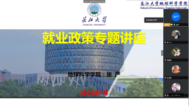 (通讯员 张严)为进一步开展好疫情防控下老员工就业创业工作,积极宣传国家就业创业政策,4月30日晚7点,地科学院利用腾讯会议平台举行了老员工就业政策解读专题讲座,2017级本科生以及部分2020届研究生和本科生参加了讲座。讲座由辅导员张严老师主持。