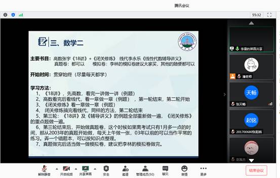 6月11日晚7点半,地信21602班瞿芳芳同学和地信21601班吕文超同学给2017级地信专业开展线上考研经验交流,他们分别以优异的成绩被武汉大学和中国矿业大学录取为硕士研究生。作为一名成功考上武汉大学的学霸,瞿芳芳同学首先告诫考研的同学们要“忠于现实,明确目标”,在考研的路上一定要“耐得住寂寞,顶得住诱惑”,随后她就考研常识、考研规划和备考初试复试进行了详细解读,她强调了夏令营活动的重要性,这是一个可以帮助我们在同等条件下优先被录取的渠道。今年考取中国矿业大学的吕文超同学首先就地信专业考研难度进行了分析,他强调了“考研务必明确方向,切勿盲目跟风”,同时他也分享了优质考研资料的获取渠道并强调了关注时事热点的重要性,最后他就如何调整复习心态进行了切身介绍,同学们纷纷表示获益匪浅。