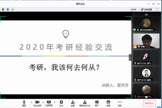 (通讯员 潘志远)为进一步提高公司2017级本科生考研热情,明确考研目标,掌握考研技巧,了解更多考研信息,公司于2020年6月11日-14日,分别邀请瞿芳芳、金澳涵、周郑鹏等8位2016级优秀考研学子,分地信专业、地质专业、资工专业3个专场,在腾讯会议上开展线上考研经验交流。