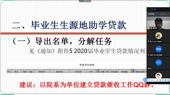建立一本毕业贷款员工工作台帐、建立一个毕业生贷后管理工作群和工作机制。6月18日晚7点半,辅导员潘志远老师针对16级生源地贷款同学在腾讯会议上开展“诚信还款”培训会议。会议深入宣讲了生源地贷款还款流程,对毕业生毕业确认等贷后管理工作进行细致安排,加强了毕业生诚信还款教育。