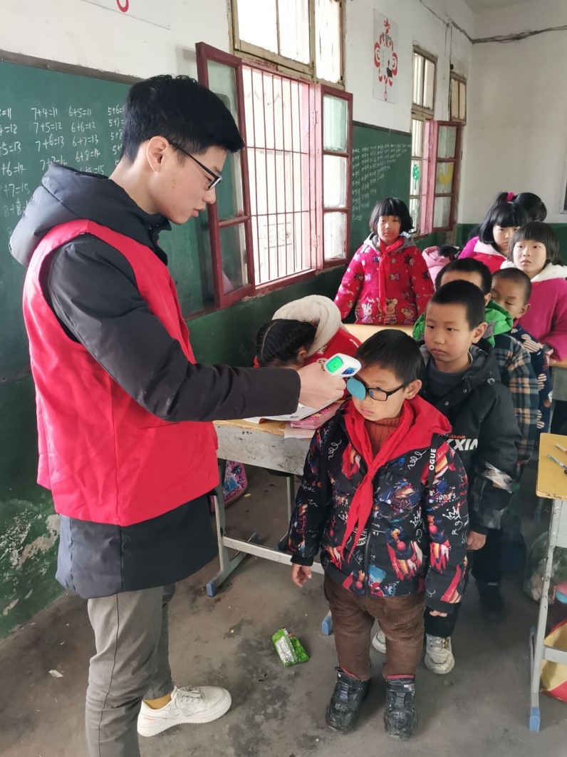 每天早上七点,张梦琪准时出现在学校大门口,为每个进入学校的员工和家长测量体温,提醒大家戴口罩。9点左右,早上的工作刚结束,又到了上午给员工们测体温的时间,还没来得及坐一会,他已经在各教室里穿梭。“请大家在走廊里排好队,听到‘嘀’的一声就测好啦。”每天三次的进教室测温,让小朋友们对这位大哥哥非常熟悉,课间的时候还经常爬到张梦琪的身上跟他打闹。“虽然工作比较琐碎,但我觉得很充实,很快乐。”回忆起他的志愿者经历,他说道,“学校人员密集,并且绝大多数是小朋友这类特殊人群,为防疫工作增加了难度与压力,听说防疫人手吃紧的消息后,我就直接参加了学校的抗疫工作,也想为母校做点力所能及的事,为孩子们做个榜样。”