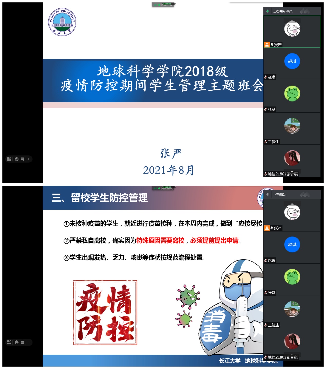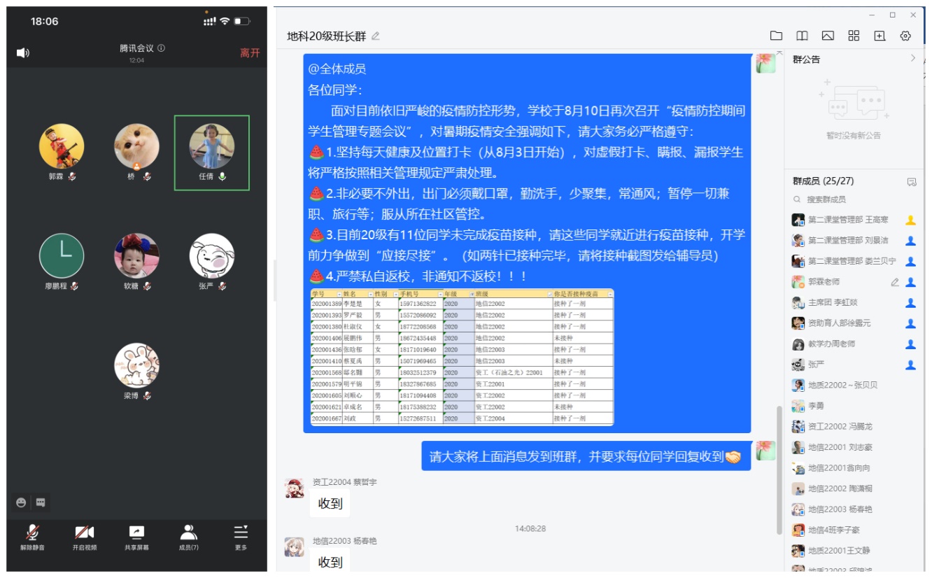 8月11日,各年级辅导员用腾讯会议组织召开主题班会。会议首先向全体同学强调了国内目前疫情动态,带领同学们再次学习了荆州市、武汉市、学校多层次的疫情防控政策,并向同学们强调要无论身在何方,一定要遵守当地防控规定。其次,分留校员工和校外员工两类群体,向大家梳理并强调了防控细则,主要包括坚持并诚信开展每日健康打卡;非必要不外出,严禁私自离校与返校,如要离校与返校必须提前提出申请;未完成疫苗接种的同学,要就近进行疫苗接种,做到“应接尽接”;出现发热、乏力、咳嗽等症状,应第一时间通知社区及辅导员;对处于中高险员工和健康码、行程码出现异常情况员工,“一对一”了解行程,并跟踪做好疏导、安抚、资助工作等。