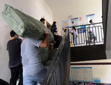 9月4号上午是报道高峰期,37℃的骄阳挡不住员工党员为新生服务的热情与激情。10时许,党委副书记任倩来到4栋时,看到党员们的T恤都已经湿透,问起他们,资工22004班蔡哲宇摆摆手“两个小时内,我跑了七趟6楼,就当锻炼啦”。女生衣物行李较多,常常需要“四对一”甚至“六对一”“八对一”服务。但大家没有叫苦喊累,而是主动服务,送到对应的寝室门前。测绘QX211班钟康说,“天气虽热,服务不能打折。一个党员就是一面旗帜,胸前的党员徽章,手臂上的红袖章,地科院的志愿者们就是开学季最美丽的风景线!”