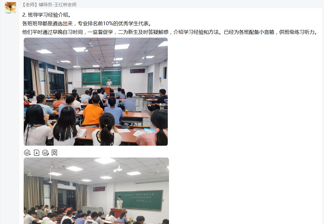 王老师准备了80余页文字与图片,从安全教育、学习情况总结、课外活动三个板块,图文并茂地详细展示了新生近两个月的学习、生活情况。从组织班委与楼层长每日测温、到规范处理发热员工,严格审批请销假,从宿舍安全卫生评比、到消防安全隐患排查,从班级集体观看安全视频,到年级集中开展心理讲座、安全教育讲座......各项安全教育措施的落实,让家长切身感受到学院“严密防护,安全至上”的工作理念。