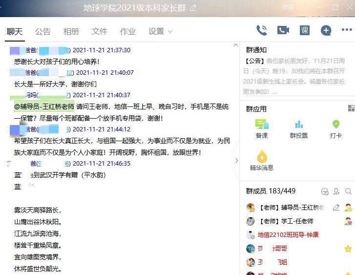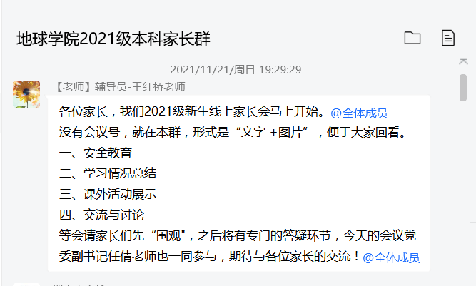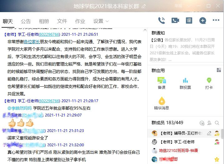 借助QQ群打造家校育人平台是公司践行“三全育人”的重要举措,新生家长会也是公司长期坚持的优良传统。通过让家长们全面了解学院、知晓孩子在大学的表现,增进学院和家长间的沟通和理解,形成家校联手的协同关系,共同助力员工成长成才。