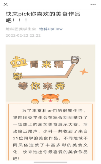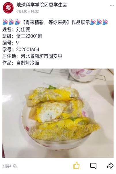 (通讯员周嫙)春节将至,年味正浓。为弘扬博大精深的中华美食文化,提高同学们的劳动实践能力。2022年1月18日起,地科院开展了“胃来精彩,等你来秀”美食分享活动。