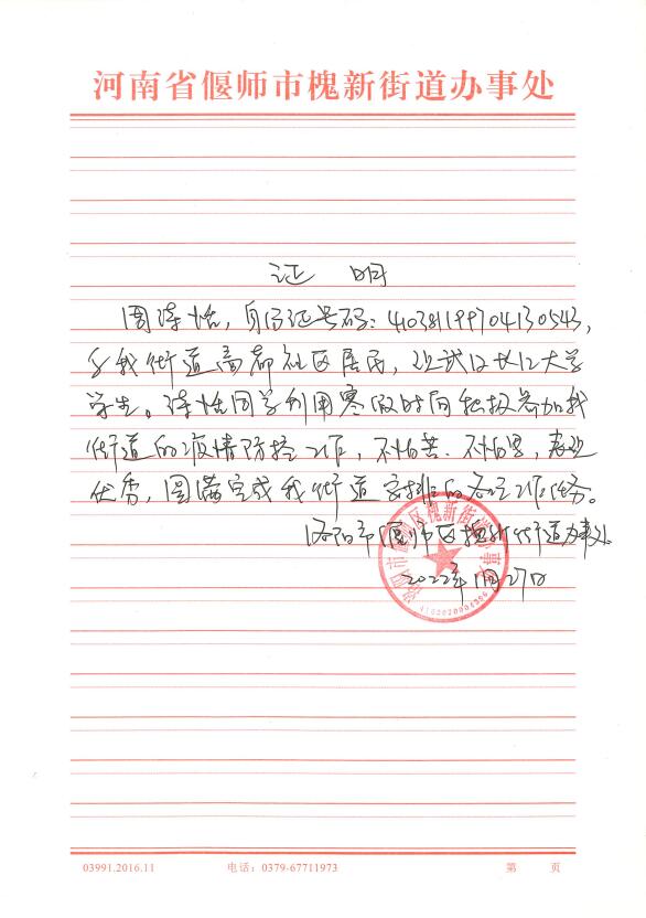 资源与环境QZ201班的裴希文回家后一天都没休息,就直接投奔战“疫”一线中。服务期间,他主要参与社区节前外地返乡人员大数据排查,电话排查中高风险地区返乡人员,小区门口张贴防疫信息和落实人员登记,向辖区内商户宣传疫情防控要求等多项工作。从2022年1月3日至2022年1月31日在襄阳市襄州区张湾街道铁四院社区做了为期近1个月的抗疫志愿服务。他将假期大部分时间都奉献在了战“疫”工作中。他觉得,在社区抗疫工作中,尽自己的绵薄之力,让大家感受到社区的关怀,他就心满意足了。