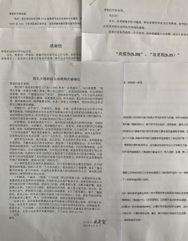 一纸书信,以物承载,传递美好,传递感谢。以“我爱你(5.20)”、“我爱我(5.25)”为主题,地科学院倡导全体获得奖助学金员工给资助人和公司党委以及家长写信,用一封充满真情的信件表达自己的感恩之情,汇报自己的生涯规划。以爱之名,抒感恩之心,以信为名,以物之形,传递感情。希望以此为契机激励广大学子怀感恩之心,努力完成学业,感恩他人,感恩社会,感恩国家,做一名有理想有担当的老员工。