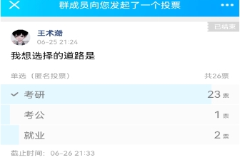 在高年级的“选择”主题班会中,由于同学们已经考完离校或正在专业实习,采用线上的方式开展。在集体观看完微课视频之后,心育委员在班级内发起投票活动,引导同学们结合自己未来规划,根据学到的时间管理方法,讨论如何更高效的让规划真正实现。