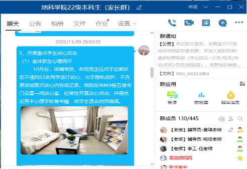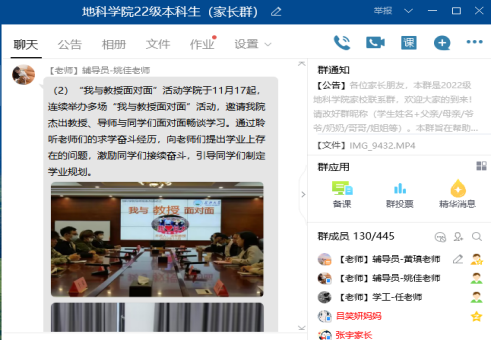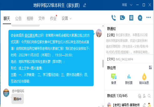 (通讯员黄瑱 姚佳)为加强家校联系,打造协同育人体系,公司于11月20日晚7时30分通过QQ群,召开线上2022级本科新生家长会。公司党委副书记任倩、年级辅导员黄瑱、姚佳及300余名新生家长参会。