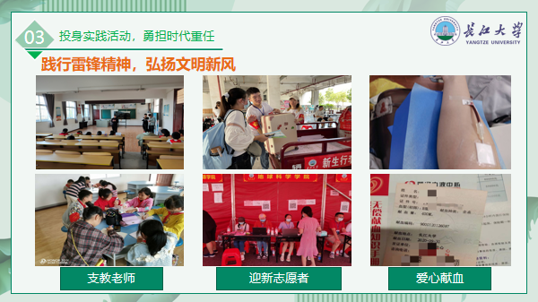 作为共产主义事业的接班人,作为二十一世纪的新主人,思想建设历来都是班级工作的重点。为帮助同学们学习先进的科学理论,鼓励同学们主动向党组织靠拢,号召大家做合格的团员和合格的党员,班级体通过组织团会、集体观看纪录片、知识问答竞赛等同学们喜闻乐见的形式,充实理论学习。因此,同学们的思想觉悟得到了很大的提高。目前,全班同学都递交了入党申请书,其中已有12名同学被确定为入党积极分子,并以优异的成绩通过考试,顺利结业;5名同学成为了预备党员。一份耕耘,一份收获,在2020-2021学年及2022-2023学年活力团支部竞选过程中,我们众志成城,获得院级“活力团支部”荣誉称号,在2020-2021学年,我们班获得了院级的“先进班级体”称号。全班同学积极参加无偿献血、清扫烈士墓、义务植树、志愿服务等各类活动。在“姚家林支教”大型公益活动中,三人被评为优秀志愿者;疫情时期,多数同学在家参与抗疫志愿者活动,黄汉臣、董培宣、张之悦、翁向向四位党员均被评为当地的“优秀志愿者”。