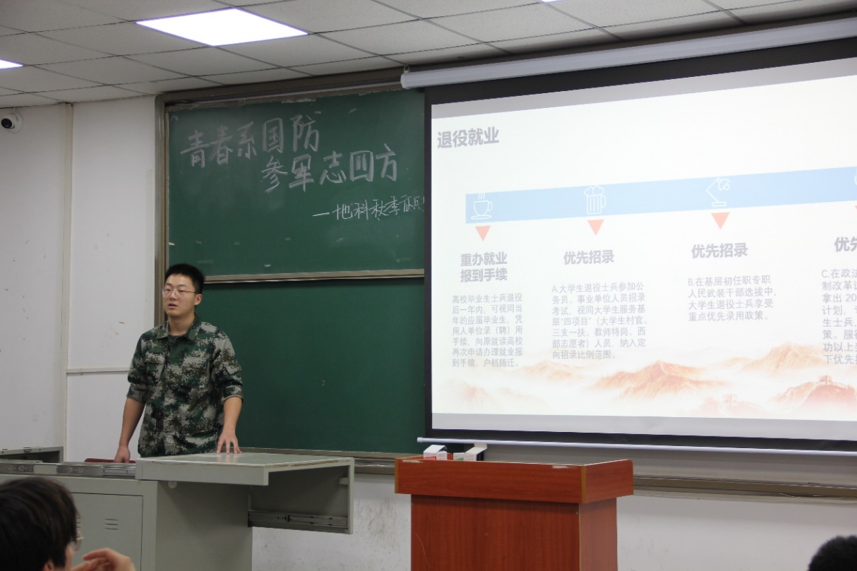(通讯员 郭浩)青春系国防,参军志四方。为响应国家号召,激发公司员工参军入伍热情,5月22日晚7时,2023年秋季征兵动员宣讲会于武教B-206举行。会议由辅导员张严老师主持,由退伍士兵、军旅之家成员孙家振、杨维鑫主讲,各班班长、团支书、宣传委员以及部分意向应征入伍的员工参会。