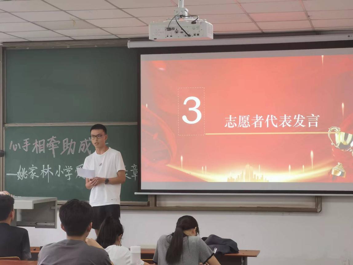 接下来,两位优秀志愿者代表分别发表了自己的支教感悟。资工22204班罗海洋同学说,他几乎每周都会参加支教活动,“责任、成长、感动”他的支教关键词。活动中他看到了很多无私奉献的同学,也结交了许多热爱志愿服务的“热心肠们”,支教让他的生活变得丰富起来。传媒学院的赵祥瑞说:“支教活动很有意义,它不关乎成绩,与不关乎其它,每个人抱着奉献的心来到这里,我喜爱这个活动,明年还会再来!”