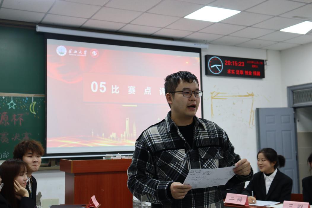 最后,黄瑱老师进行总结点评。他对辩手们的青春热情、自信阳光、仪表大方、积极向上的风采给予赞扬,同时认为此次比赛不仅为同学们提供了一个展现自我的平台,也是促进班级之间交流思想,互相学习的良好途径,并希望同学们学以致用,取长补短,共同进步。