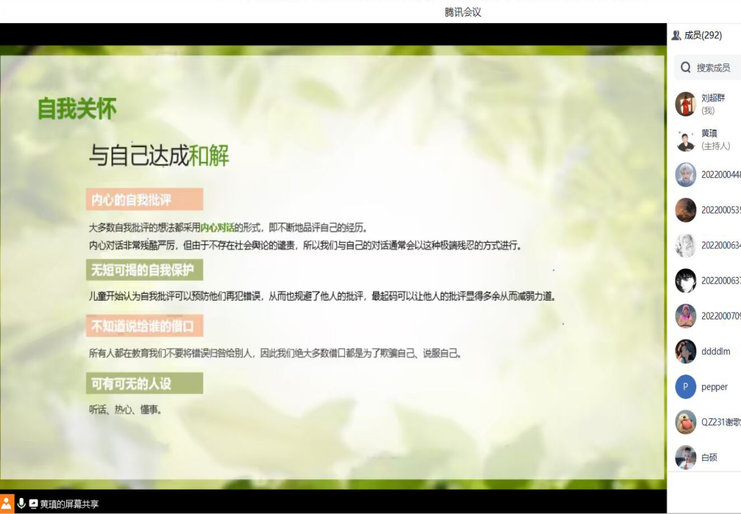 针对研究生普遍存在的睡眠问题,王红桥老师介绍了冥想、户外运动等改善睡眠的实用方法。对于日常出现的负面情绪,她鼓励大家要从吃好每一顿饭、睡好每一觉开始,在关心他人的同时也要做好自我关怀。黄瑱老师提醒大家人际交往的前提是平等、互惠,要时常用善意的话语赞美他人,传递爱与温暖,最终自己也会被爱所围绕。