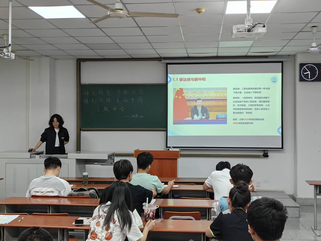 首先,班主任们介绍了“碳达峰、碳中和”的相关概念及提出背景。近年来,随着各国二氧化碳排放,温室气体猛增,人类面临着气候快速变暖的全球性问题,对生命系统形成威胁。在这一背景下,我国以习近平同志为核心的党中央统筹国内国际两个大局提出碳达峰和碳中和的重大战略决策。接着,老师们向大家宣传绿色低碳引领行动、生活垃圾分类、反对食品浪费、绿色校园创建等内容,并倡导同学们将低碳、环保等理念应用到日常生活中去。同学们纷纷表示保护环境,人人有责,将从身边的小事做起,从我做起,充分发挥好新时代老员工在落实“双碳“行动,共建美丽家园”上的先锋模范带头作用,尽力做到保护好地球,守护好我们的家园。