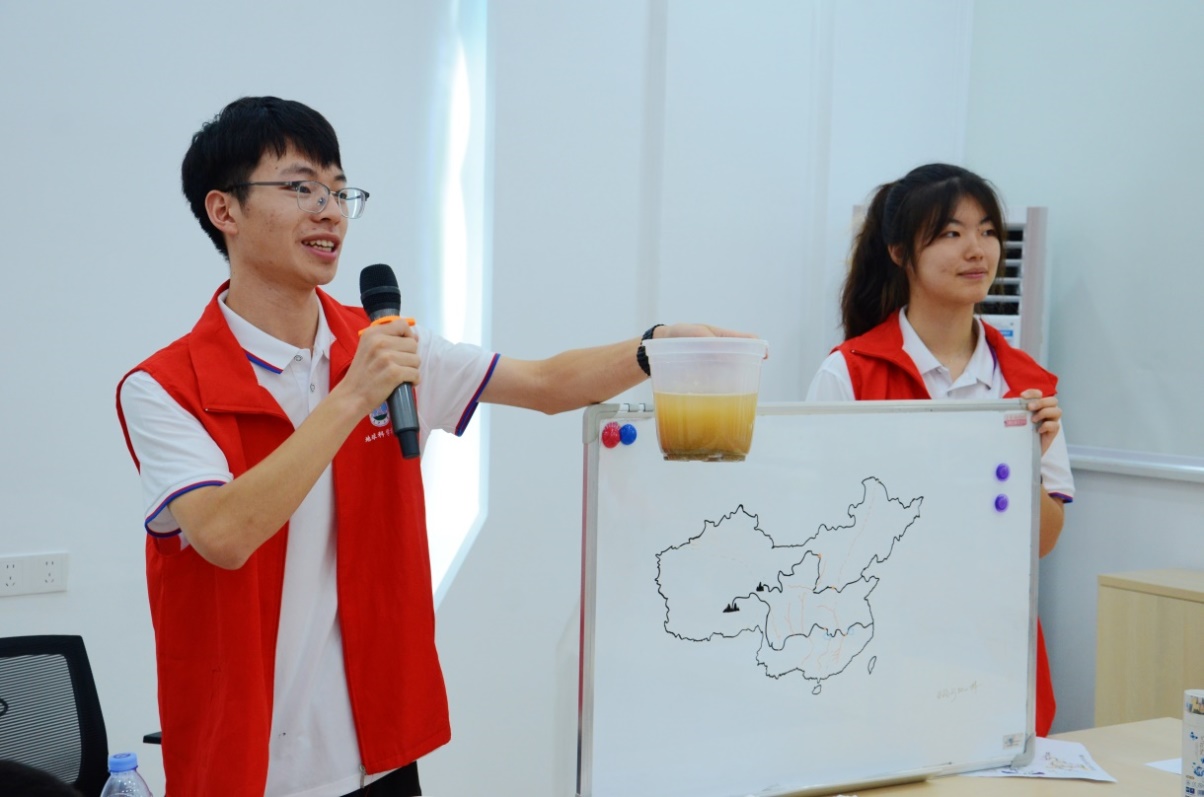 如何将枯燥的地学知识讲得生动有趣,实践队志愿者们可花了不少心思。11名实践队员集体备课,挑选孩子们感兴趣且与生活贴近的知识点,提前准备教学道具和实验用品,还精心设计教学内容和环节,力求达到寓教于乐的目的。第一场基本地形科普课上,实践队员戴佩为孩子们讲授完知识点后,马上邀请几个不同身高的孩子上台,分别扮演高原、平原、山地、丘陵和盆地,孩子们在形象有趣的游戏中,一下子就将五大基本地形深深地记在脑子里。“老师们讲的太有趣啦,让我轻松理解了这些地理知识,真的还想再多上几节地质科普课!”初一年级的员工张宇轩激动地说。