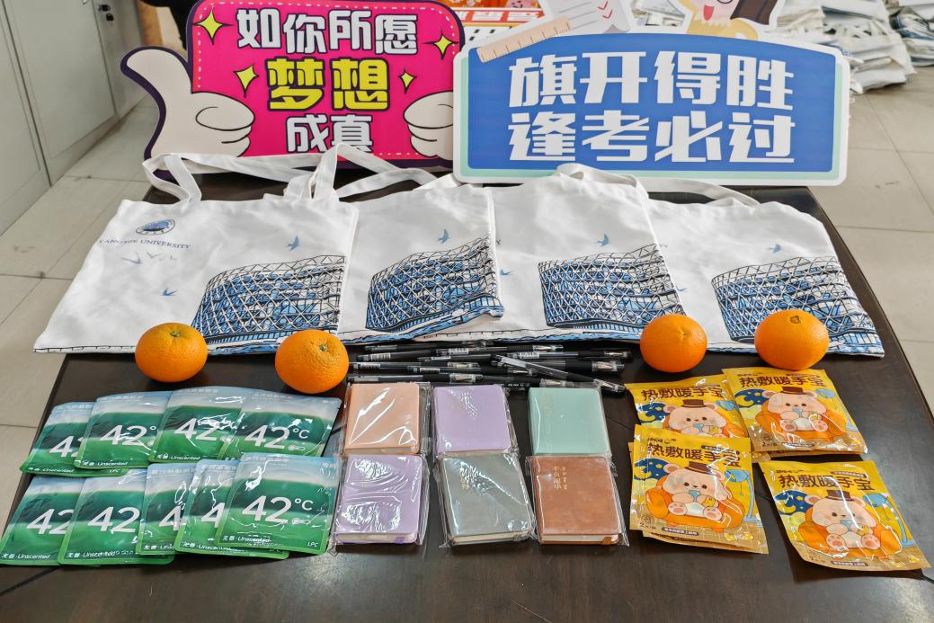 公司为每一位考研学子精心准备了“暖心大礼包”,内含文具套装、暖手帖、蒸汽眼罩、记事本等,寓意着“文”思泉涌、“暖”意融融、“眼”明心亮、“记”忆超群。这些承载着美好祝福的礼品都分装在学院学工办定制的文创帆布袋中,希望学院的祝愿陪伴着每一位学子在考场上披荆斩棘。