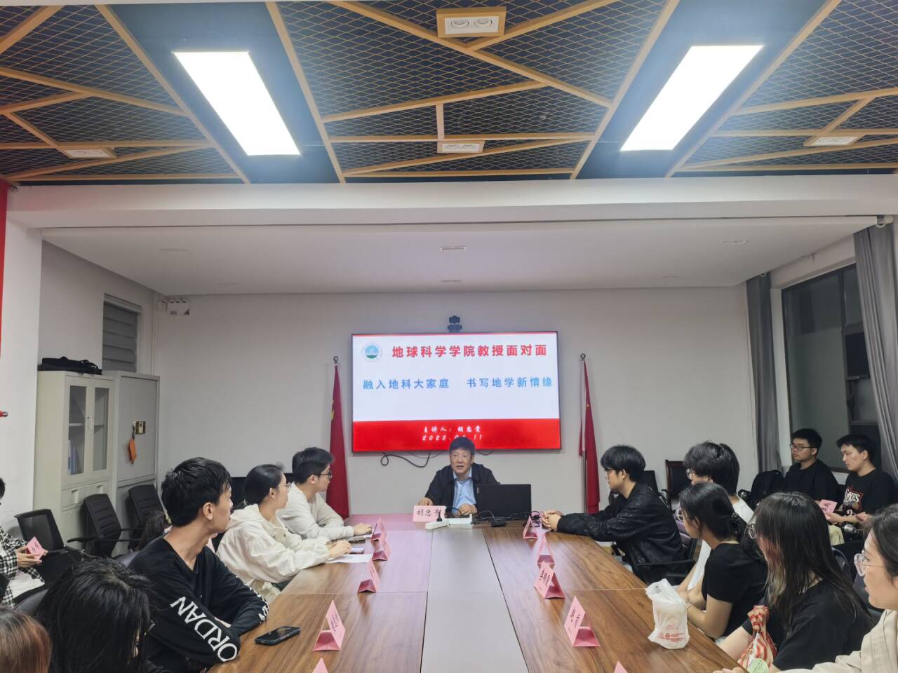 座谈会上,胡教授从学院历史积淀,学科发展前沿,人才培养特色,三个维度展开分享。他分享了学院的发展历程和近年来在教学方面取得的丰硕成果和各种奖项,从教学课程、教学资源、学科竞赛等多个方面深入阐述了学院对员工的培养计划,并以优秀毕业生为案例激励同学们在本科阶段扎实专业基础课程,做好学习规划,努力奋斗,让同学们明确专业特征,树立学习目标。同时,胡教授为各位新同员工动详细地讲解了沉积岩的形成过程,激发了各位同学的学习兴趣与学习热情。
