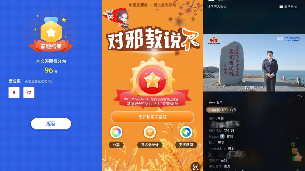 直播观看完毕后,公司各班纷纷开展了国家安全主题班会。在班会上,各年级辅导员、班主任老师与同学们一起观看了“反邪教警示教育进校园”视频。同学们围绕“日常生活中如何维护国家安全与防范邪教”展开讨论,并纷纷在“中国反邪教”公众号上进行网上签名,积极参与“全国老员工国家安全知识答题”活动,增强了同学们国家安全责任意识和社会责任感。