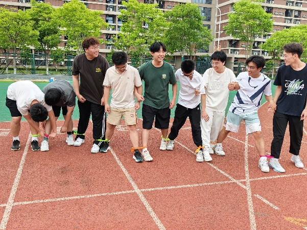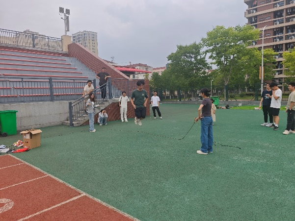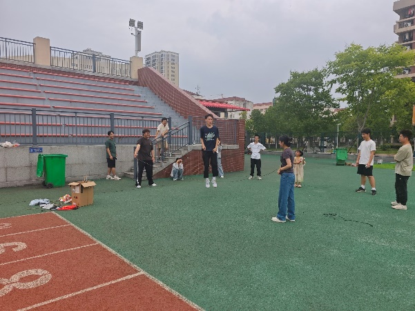活动当天,操场上气氛热烈。在“九人十足”项目中,成员两两绑腿,喊着口号并肩前进;即便节奏错乱,也相互鼓励、积极调整。跳大绳时,摇绳与跳绳成员配合默契,大家在快速跃动中挑战自我。这些项目既考验了成员间的协调配合能力,又展现了互帮互助的团队精神和勇于拼搏的青春风采。
