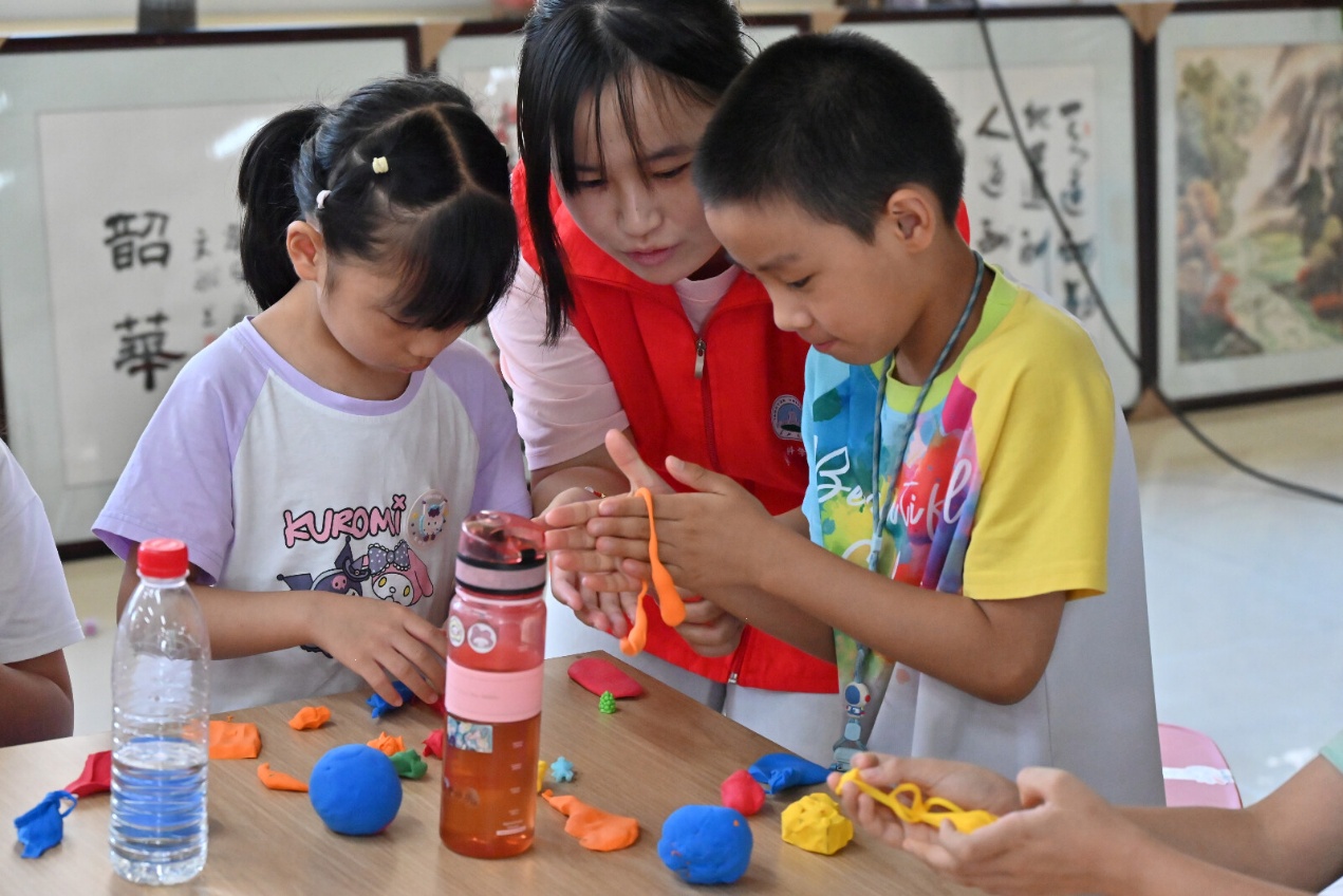 随后的“橡皮泥地球”环节里,黄、红、橙、蓝四色橡皮泥被捏成地球的内核和外核、地幔与地壳,孩子们边堆叠边听讲解:“我们所在的的地壳与地球相比,其实像鸡蛋壳一样薄!”最热闹的当属“地层沉积模拟”,一层层橡皮泥在手中压实,孩子们亲眼见证“岩石如何历经万年形成”,易君恒举着作品大喊:“这是我做的,里面还被我加了‘化石’呢!我要学习更多知识,长大以后也去挖化石!“
