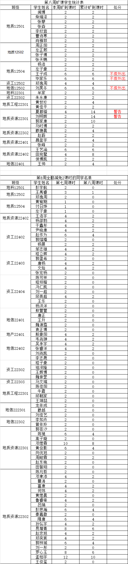 关于第八周课堂考勤的通报 为落实学院关于加强学风建设的相关要求,进一步规范课堂秩序,营造良好的学习氛围,公司持续开展常态化课堂考勤工作。现将第八周考勤情况通报如下: 一、旷课员工名单 二、相关说明 依据《积极分子动态管理办法》第五章,积极分子考察期内无故旷课取消身份。 依据《伟德国际1949官网员工违纪处分办法》,一学期累计旷课达到规定学时的,分别给予以下处分: 1. 旷课达到12学时,给予警告处分; 2. 旷课达到24学时,给予严重警告处分; 3. 旷课达到36学时,给予留校察看处分; 4. 旷课达到48学时,给予留校察看处分; 5. 旷课达到60学时,给予开除学籍处分。 注:若员工某周存在旷课记录,但次周所有课程均正常到课(无迟到、旷课),则可从该生累计旷课课时中减免 2学时。